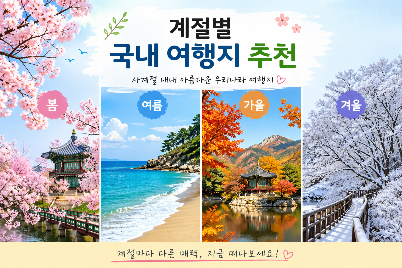 특히 국내는 사계절이 뚜렷하기 때문에 계절마다 즐길 수 있는 매력이 분명합니다. 봄에는 꽃이 피고, 여름에는 바다와 계곡이 활기를 더하며, 가을에는 단풍이 물들고, 겨울에는 눈과 따뜻한 온천이 여행의 분위기를 바꿔줍니다.
